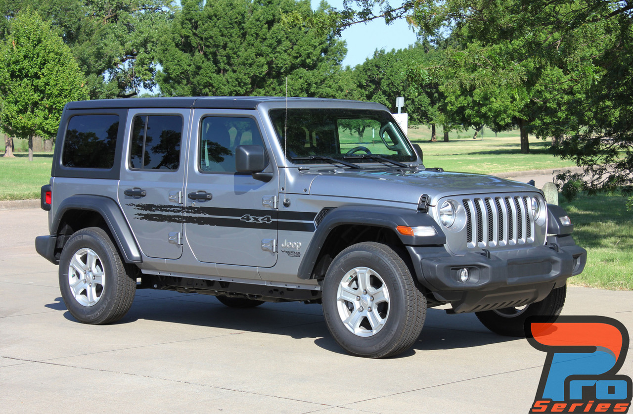 | DESCRIPTION | 2017 Jeep Wrangler DecalsVinylGraphicsPro now features the HAVOC Jeep Wrangler JL Sport and Jl Unlimited vinyl graphic decal stripe kit for the new 2018-2026 Jeep Wrangler models. This is a driver and passenger side body graphic design Jeep Wrangler JL or Jeep Wrangler JL Unlimited side stripes vinyl graphic kit which includes both left and right side vinyl graphic decals. This graphic kit is expertly "cut to fit" by professionals for this model year of Jeep Wrangler, and the vinyl graphic film used from 3M and Avery Dennison offer manufacturer ratings of five to 8 plus years for life expectancy of the vinyl, when manufacturer care tips are followed carefully. See below for more details on the cast vinyl series used to make these OEM factory style auto stripes. 2017 Jeep Wrangler Decals and 2018 Jeep Wrangler GraphicsVinylGraphicsPro has vinyl graphic kits that add muscle car style to any Jeep Wrangler model. These vinyl decal sections are pre-cut from professional grade 3M or Avery automotive grade high performance vinyl. Our team of professionals use modern manufacturing techniques allowing us to offer the highest quality vinyl graphic and decal striping kits available on the market today. This makes installing a VinylGraphicsPro Jeep Wrangler stripe kits simple. Because each vinyl graphic decal is precision cut, this will ensure an exact fit for the make, model, and year of your Jeep Wrangler with little to no trimming needed. | ||