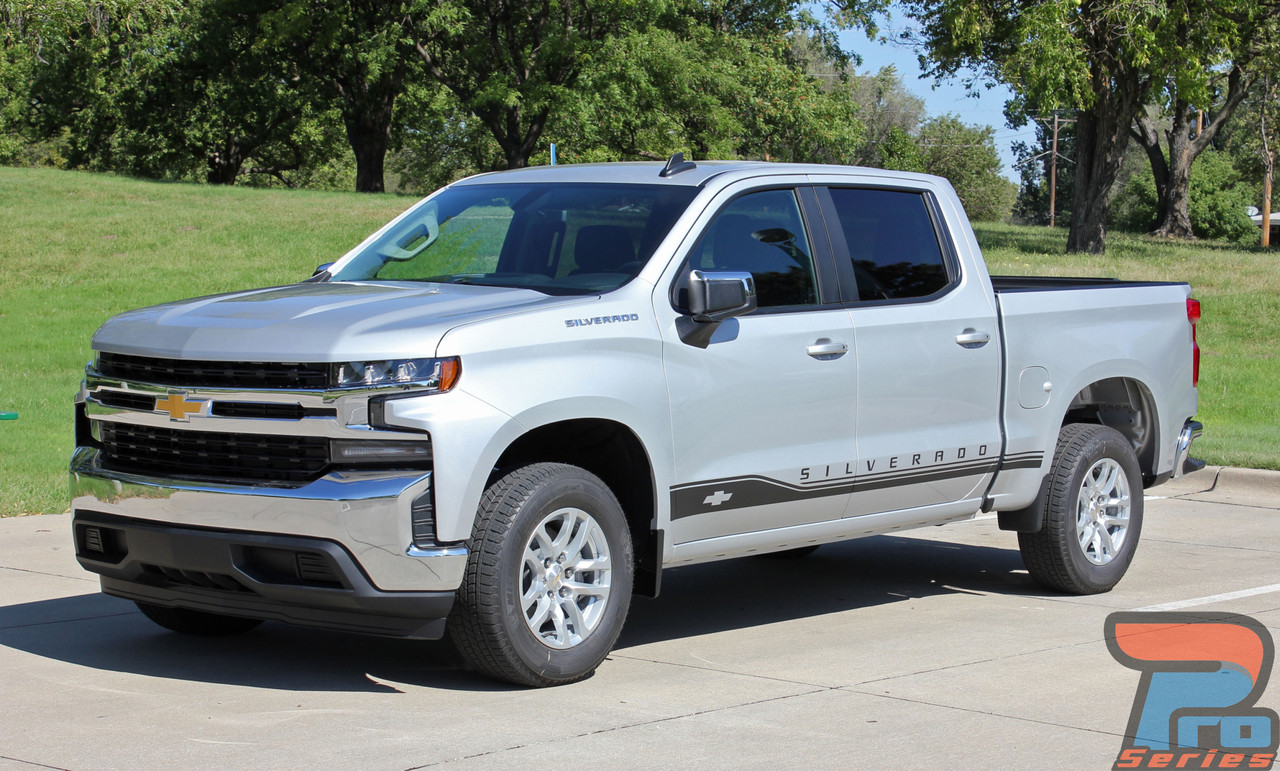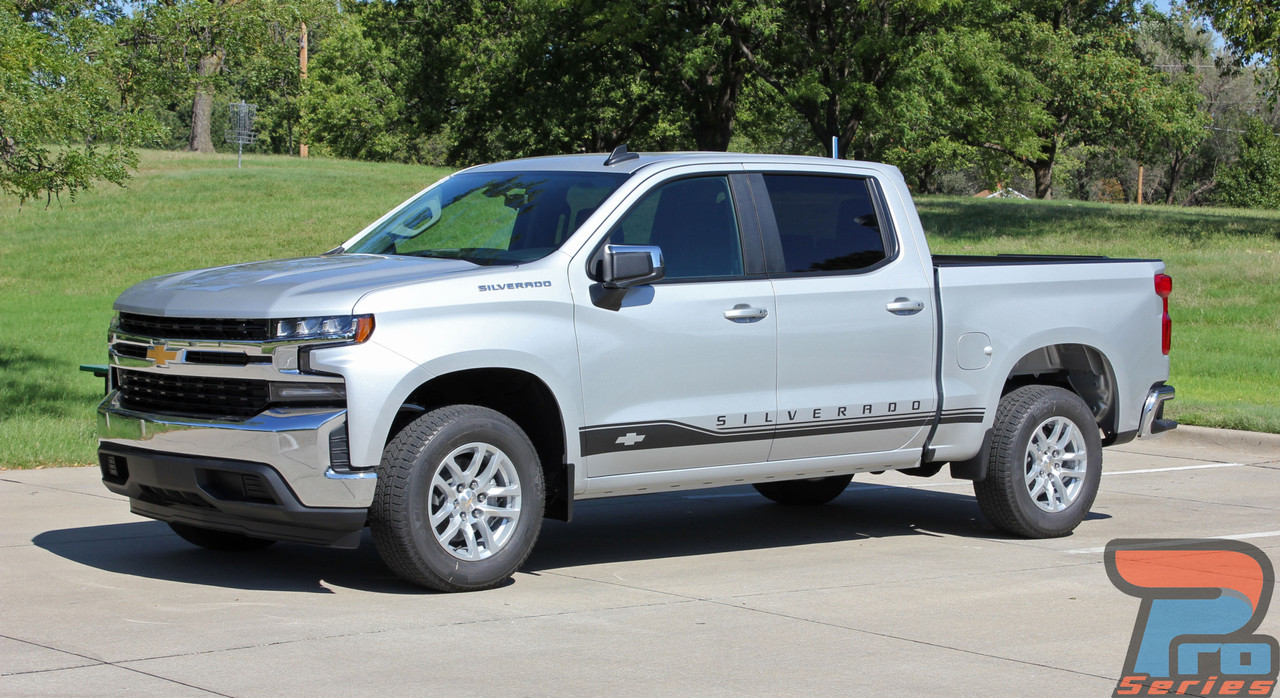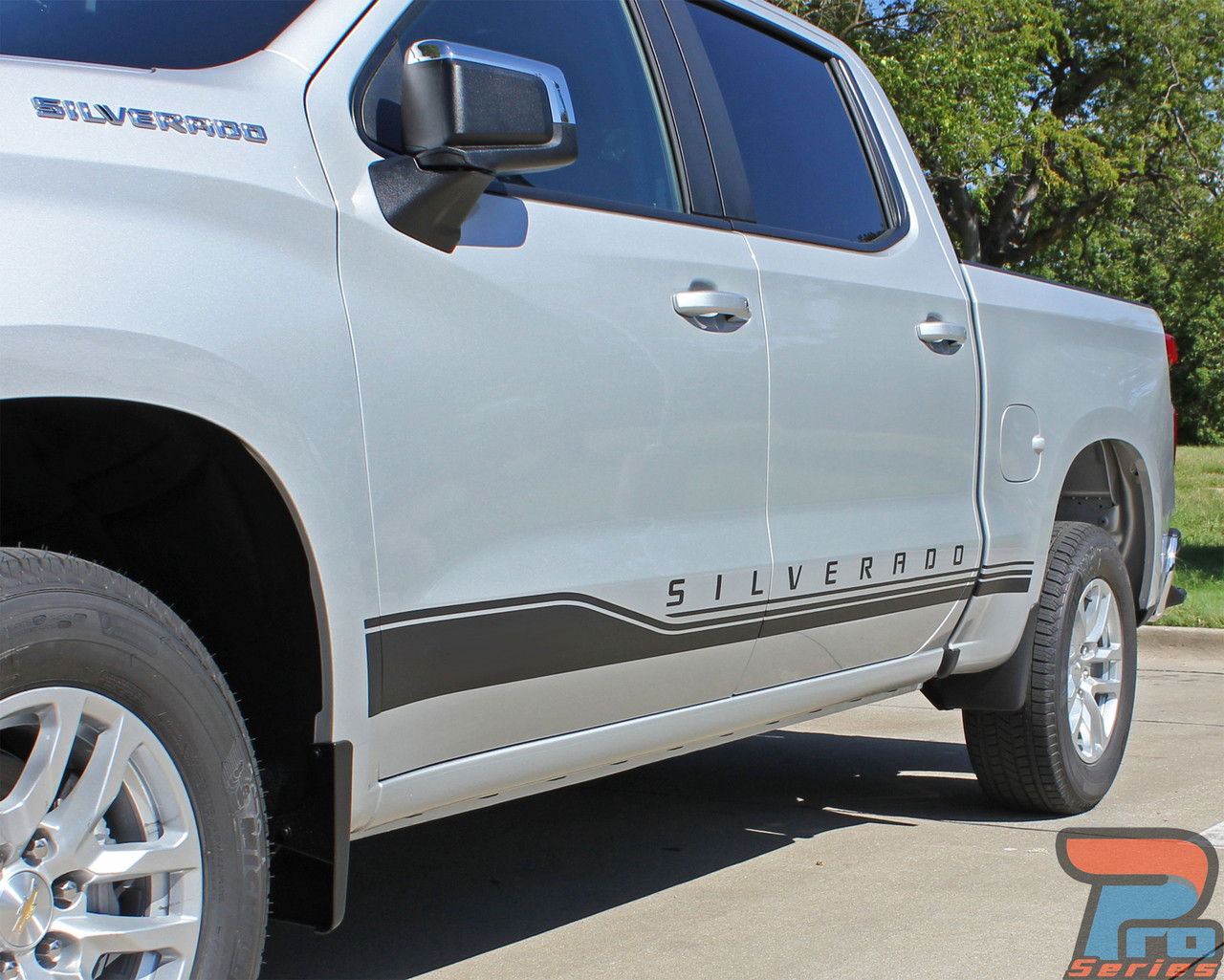 | DESCRIPTION | 2019 2020 Chevy Silverado Side Decal KitVinylGraphicsPro now features the SILVERADO ROCKER ONE vinyl graphic stripe decal kits for the 2019, 2020, 2021, 2022, 2023, 2024, 2025, 2026 Chevy Silverado 1500 models is an lower body line accent rally side truck accent vinyl graphic kit which includes driver and passenger side vinyl stripe graphic decals. This graphic kit is expertly "cut to fit" by professionals for this model year of Chevrolet Silverado 1500 LS LT LTZ, and the vinyl graphic film used from 3M and Avery Dennison offer manufacturer ratings of five to 8 plus years for life expectancy of the vinyl, when manufacturer care tips are followed carefully. See below for more details on the cast vinyl series used to make these OEM factory style auto stripes. | ||