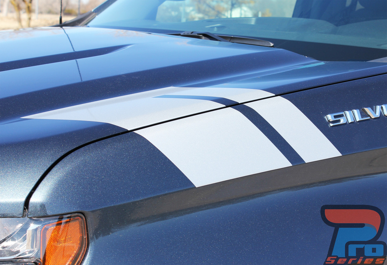 2020 Chevy Silverado Fender StripesVinylGraphicsPro now features the 1500 HASHMARKS vinyl graphic stripe decal kits for the 2019-2024 Chevy Silverado Fender Stripes models is a driver and passenger side hood to fender decal and vinyl graphics with a trail hood stripe style vinyl graphic kit which includes hood stripes graphic decals. This graphic kit is expertly "cut to fit" by professionals for this model year of Chevrolet Silverado 1500 LS LT LTZ, and the vinyl graphic film used from 3M and Avery Dennison offer manufacturer ratings of five to 8 plus years for life expectancy of the vinyl, when manufacturer care tips are followed carefully. See below for more details on the cast vinyl series used to make these OEM factory style auto stripes. |
