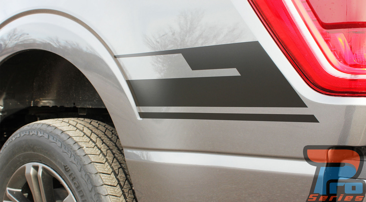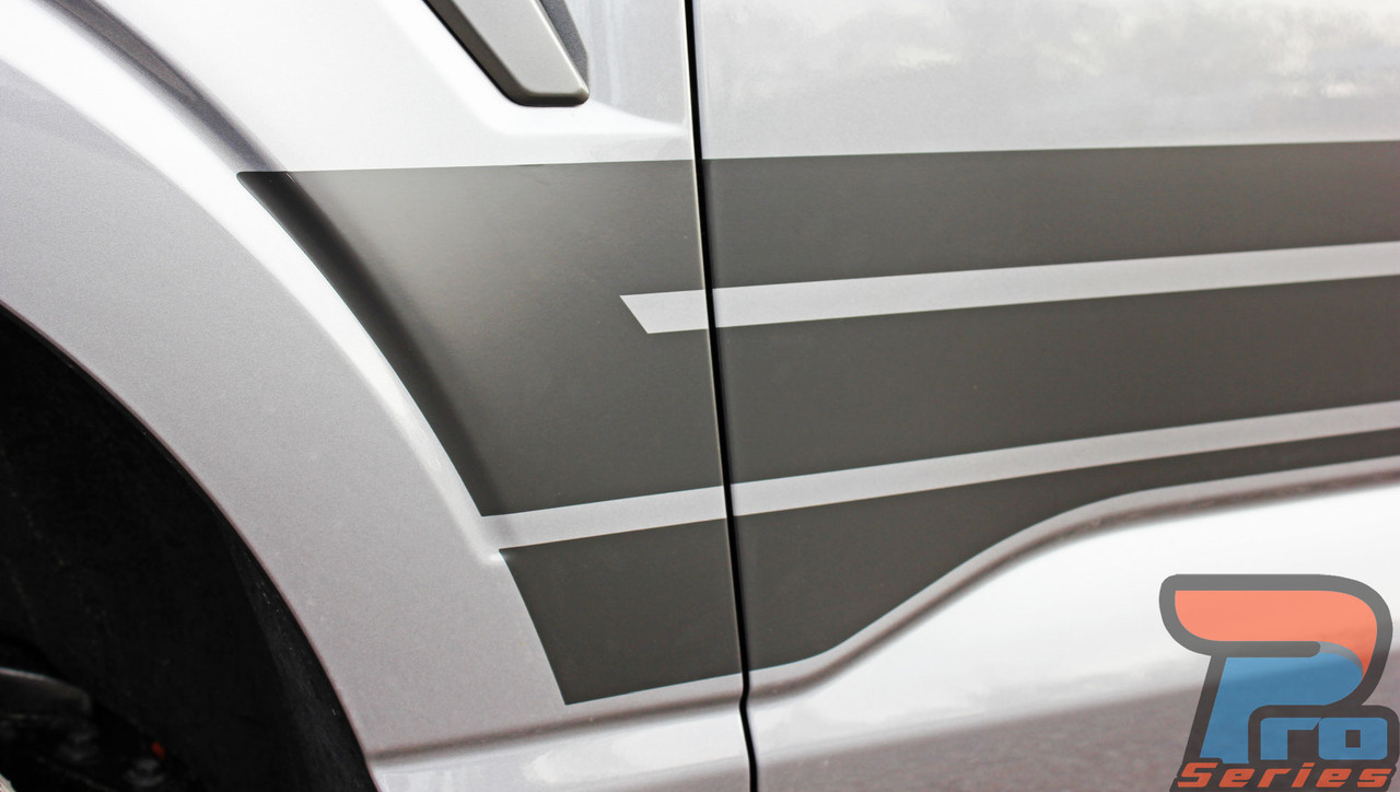 | DESCRIPTION | 2021, 2022, 2023, 2024, 2025, 2026 F-150 SWAY XL Side Door Body Stripes Vinyl Graphic Decals Kit : Ford F-Series F-150 Vinyl Graphics Decals Stripes Kit VinylGraphicsPro now features the F-150 SWAY XL vinyl graphic decal stripe kit for the 2021, 2022, 2023, 2024, 2025, 2026 Ford F-150, F-150 XL, F-150 XLT, F-150 Lariat, F-150 King Ranch, F-150 Platinum, F-150 Limited models. This is a door stripe vinyl graphic kit which includes driver and passenger striping decals. This vinyl graphic kit is expertly "cut to fit" by professionals for this model year of Ford F-150, and the vinyl graphic film used from 3M 2080 Air Release and Avery Dennison Supreme Wrap offer manufacturer ratings of five to 8 plus years for life expectancy of the vinyl, when manufacturer care tips are followed carefully. See below for more details on the cast vinyl series used to make these OEM factory style auto stripes. | ||