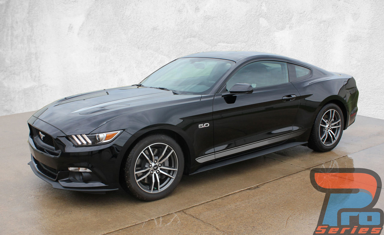 Lower Faded Stripes for Ford MustangVinylGraphicsPro now features the Mustang FADED ROCKERS vinyl graphic decal stripe kit for the 2015 2016 2017 Ford Mustang, Mustang GT, Mustang Fastback, Mustang Convertible, Mustang Boss 5.0, Mustang GT500, Mustang Ecoboost V6 and four-cylinder models. This is a lower door rocker panel stripe fade style vinyl graphic kit which includes driver and passenger striping decals. This vinyl graphic kit is expertly "cut to fit" by professionals for this model year of Ford Mustang, and the vinyl graphic film used from 3M 1080 Air Release and Avery Dennison Supreme Wrap offer manufacturer ratings of five to 8 plus years for life expectancy of the vinyl, when manufacturer care tips are followed carefully. See below for more details on the cast vinyl series used to make these OEM factory style auto stripes. |
