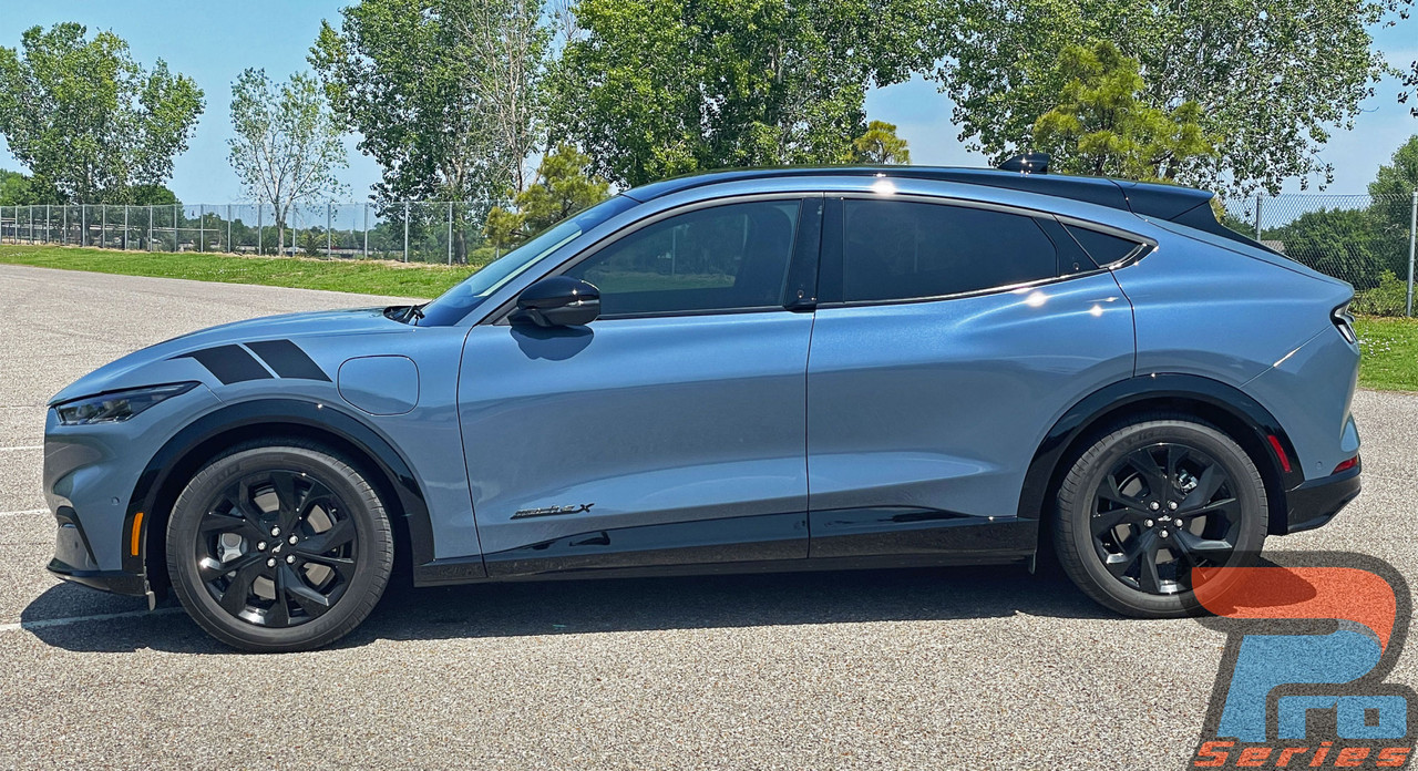 | DESCRIPTION | Mustang Mach-E MACH-E BREAKER ARC Hood Stripes Double Bar Side Body Vinyl Graphic Decals Stripes Kit : Ford Mustang Mach-E Vinyl Graphics Decals Stripes Kit VinylGraphicsPro now features the Mustang Mach-E MACH-E BREAKER ARC vinyl graphic decal stripe kit for the 2021, 2022, 2023, 2024, 2025, 2026 Ford Mustang Mach-E, Mustang Mach-E GT, Mustang Mach-E Premium, Mustang Mach-E Convertible, Mustang Mach-E California Route 1 models. This is a racing stripes body kit style vinyl graphic kit which includes hood to fender body striping decals. This vinyl graphic kit is expertly "cut to fit" by professionals for this model year of Ford Mustang Mach-E, and the vinyl graphic film used from 3M 2080 Air Release and Avery Dennison Supreme Wrap offer manufacturer ratings of five to 8 plus years for life expectancy of the vinyl, when manufacturer care tips are followed carefully. See below for more details on the cast vinyl series used to make these OEM factory style auto stripes. | ||
